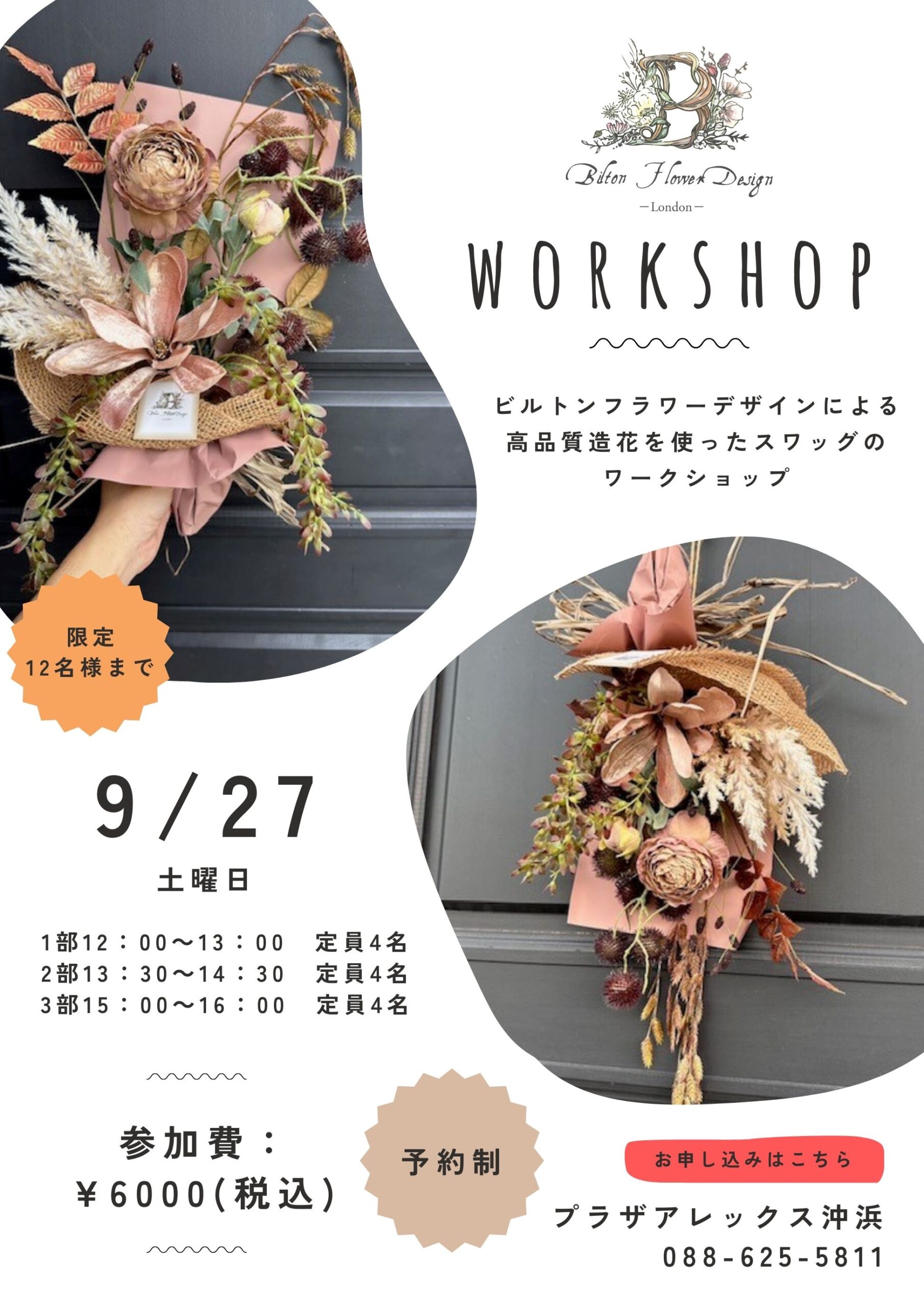 2025.09.10 【沖浜】WORKSHOPEVENTのお知らせ ⭐9/27(土)⭐ ビルトンフラワーデザインによる 高品質造花を使ったスワッグのワークショップ 💐予約制💐 1部 12:00~13:00 定員4名 2部 13:30~14:30 定員4名 3部 15:00~16:00 定員4名 💐限定12名様まで💐 💐参加費¥6000税込💐 ご予約はPLAZAALEX沖浜店 ☎088-625-5811まで ※直接、店舗での申し込みも承ります!!