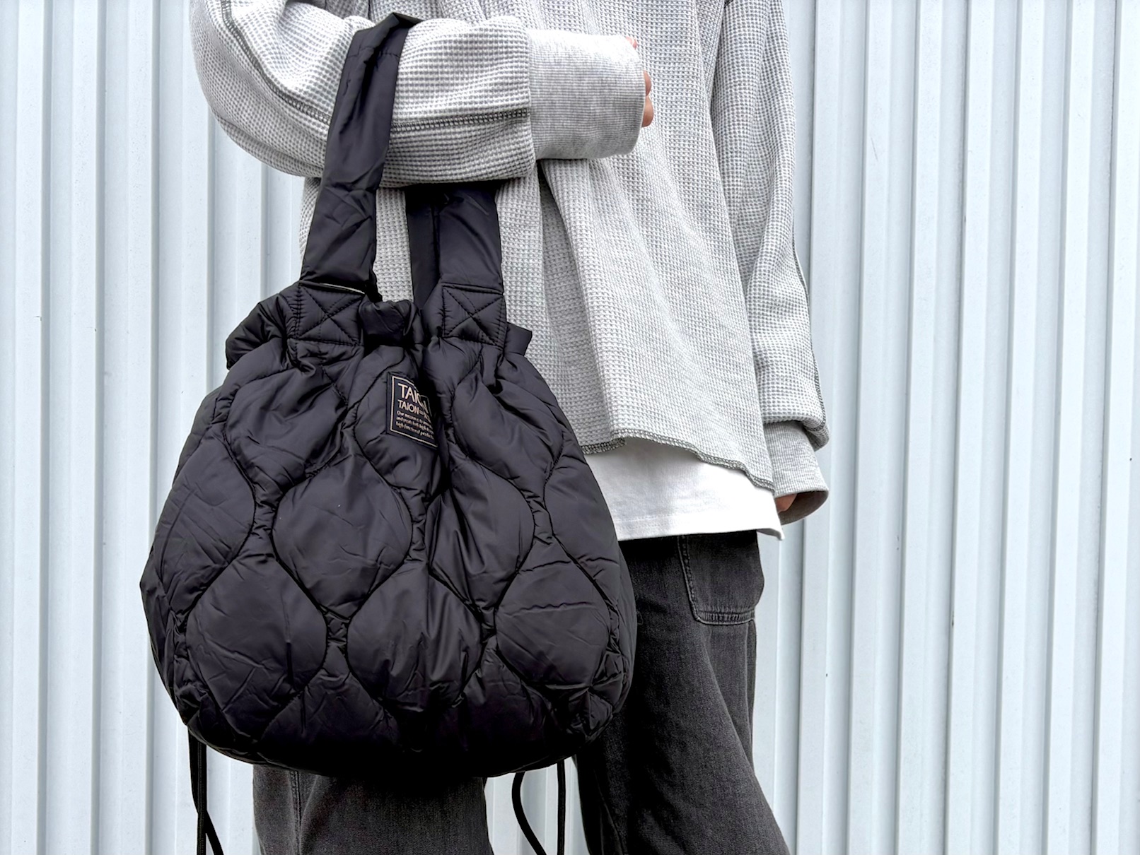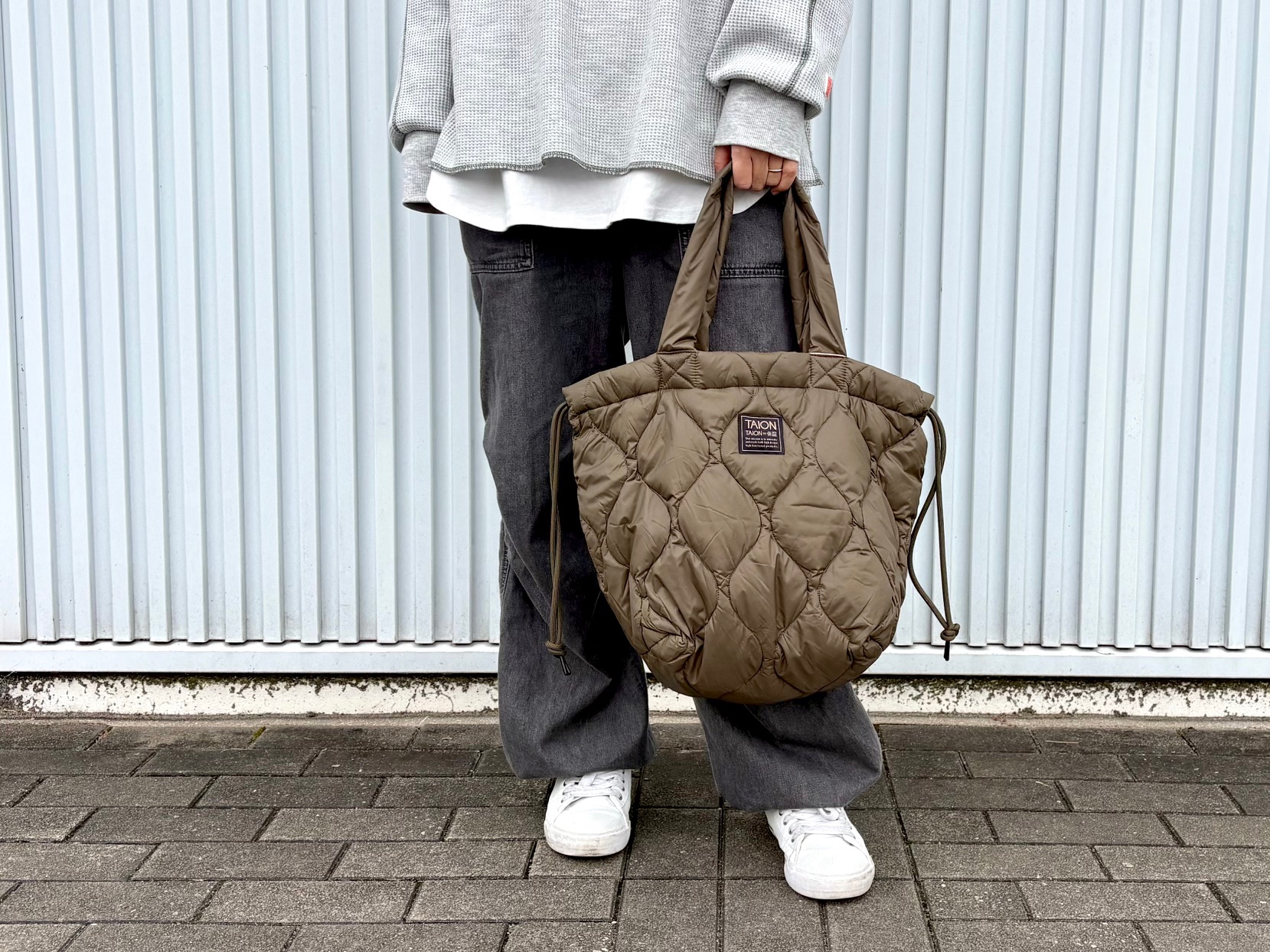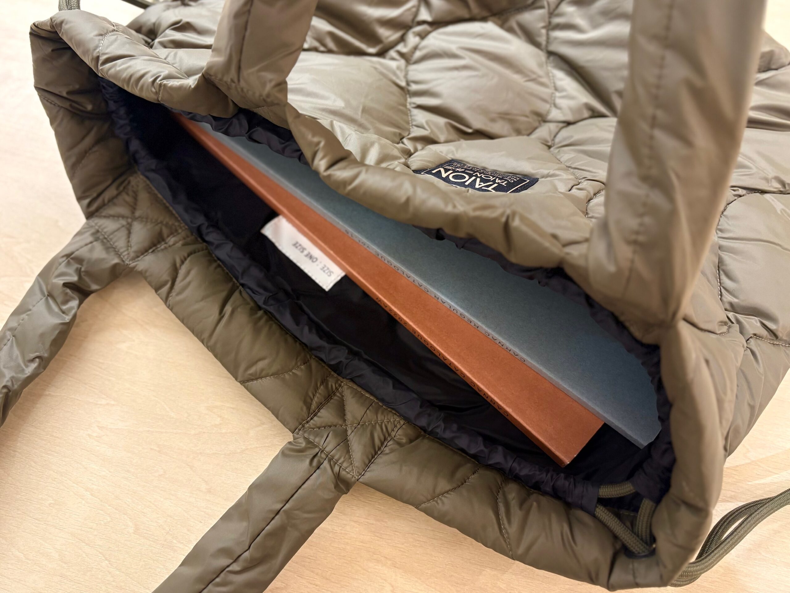 2025.12.19 NEW ARRIVAL 【NEW ARRIVAL】 軽くて柔らかい張りのある高密度生地を使用した TAIONのダウントート。 A4サイズも入る普段使いしやすいサイズ感と ご家庭でお洗濯ができるのもうれしいポイント。 バッグ口を絞ると巾着バッグに変化し、 スタイルに合わせて2WAYで楽しめます。 冬のファッションのアクセントにいかがでしょうか? ミリタリー ダウントートバッグM-ソフトシェル ¥4,950‐